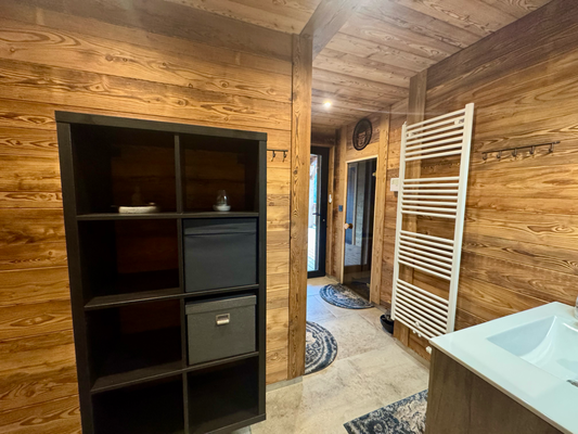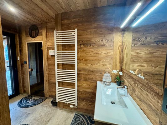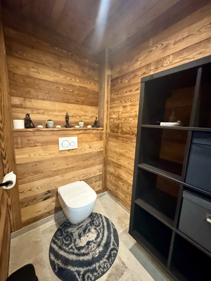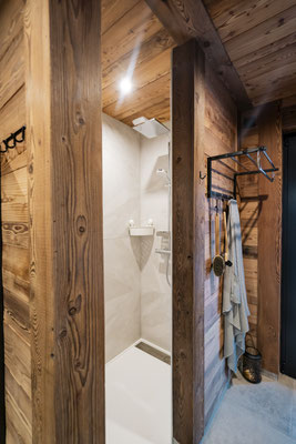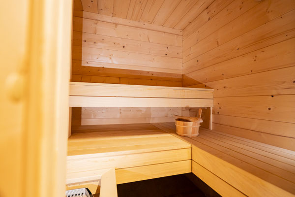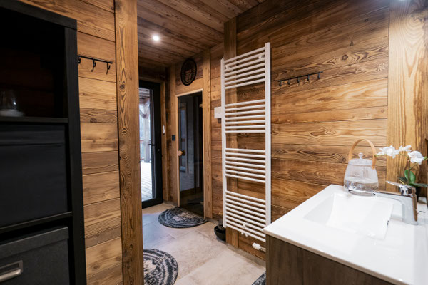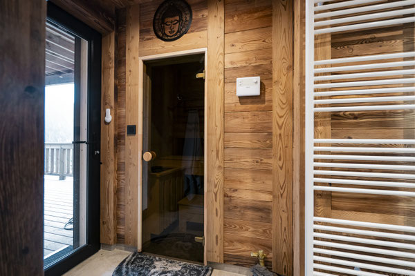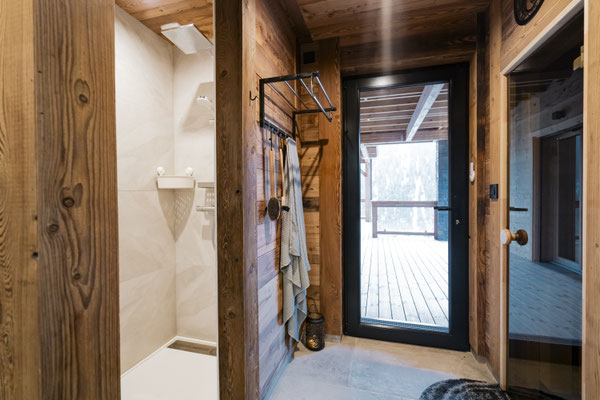 salle de douche avec un sauna et un toilette en suite du dortoir accès au jacuzzi exterieur