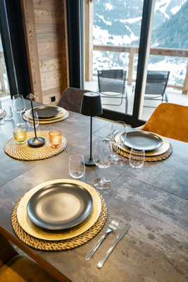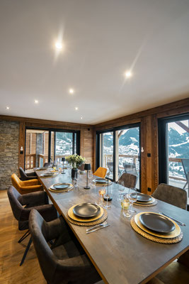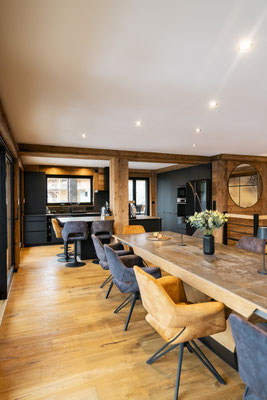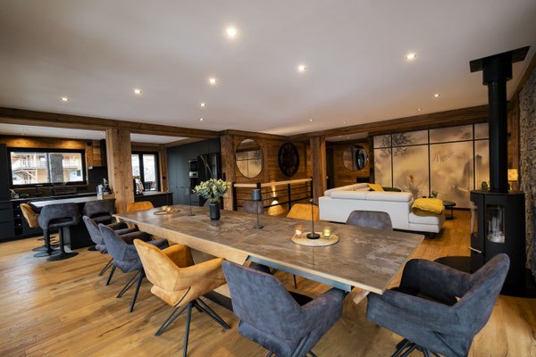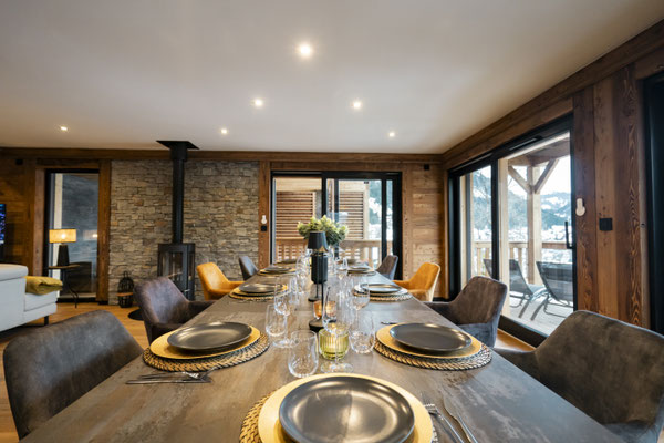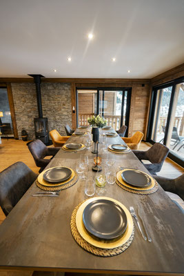 La table de la pièce à vivre est équipée de 10 chaises il est possible de rajouter une rallonge pour manger à 15 personnes