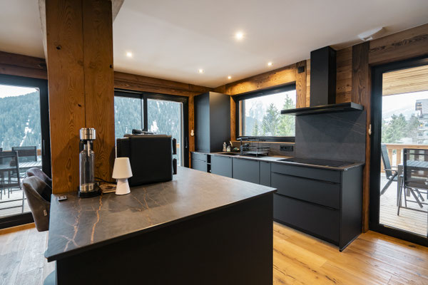 Pièce à vivre avec cuisine équipée ouverte accès à un beau balcon terrasse ( table et chaises extérieur )